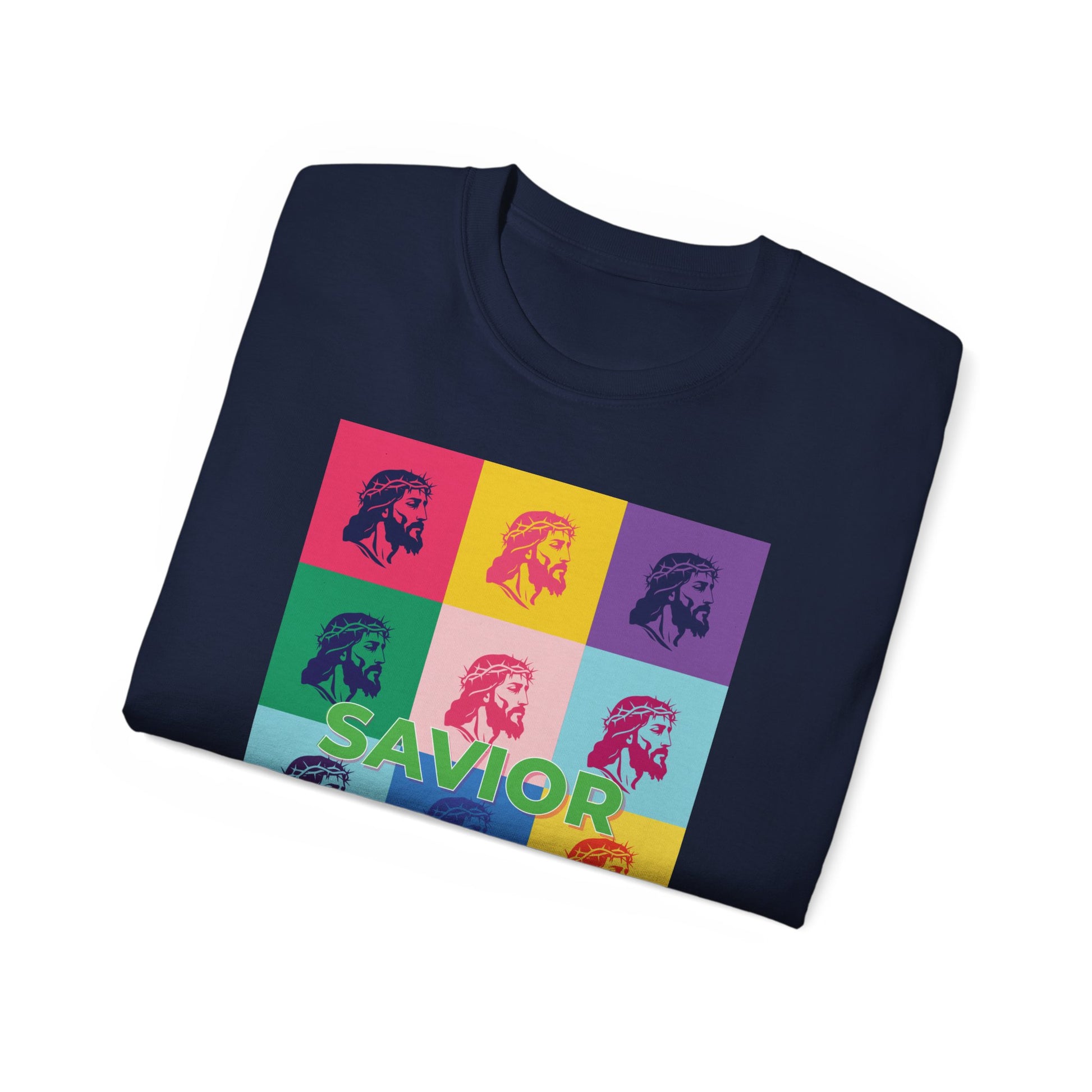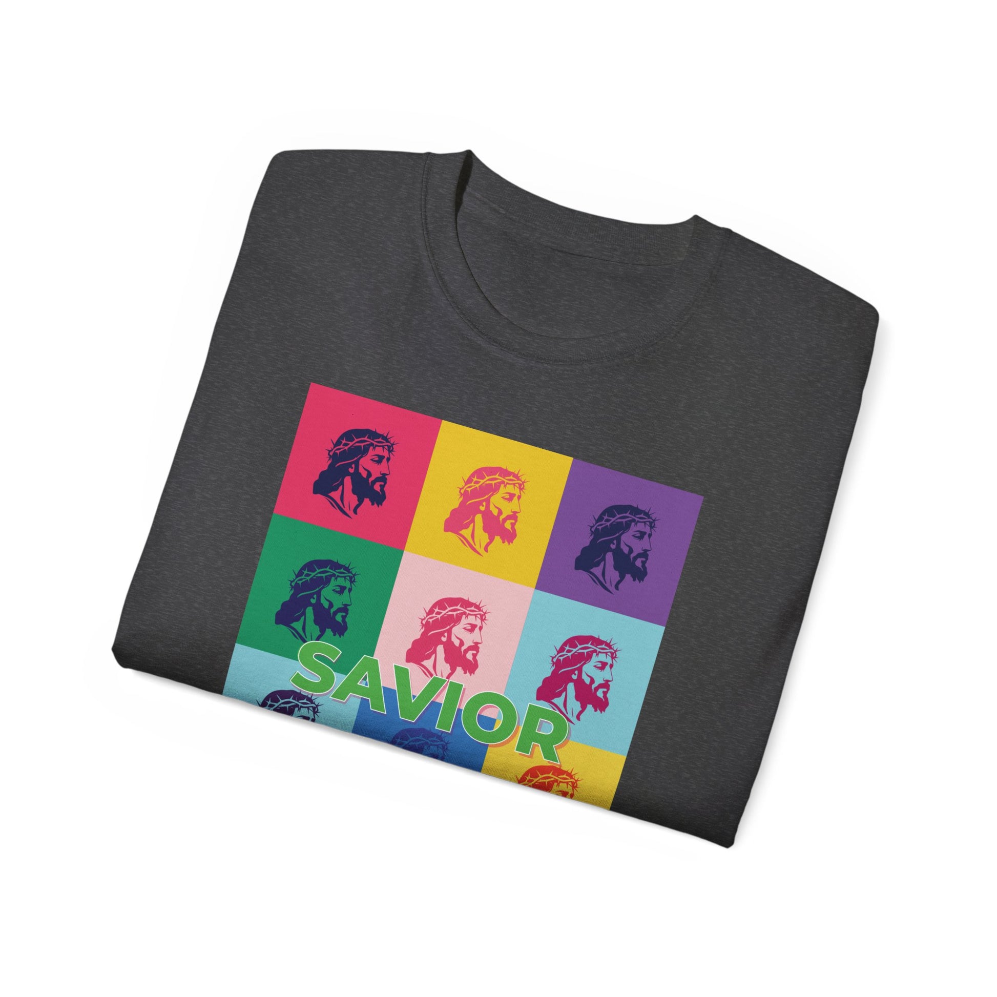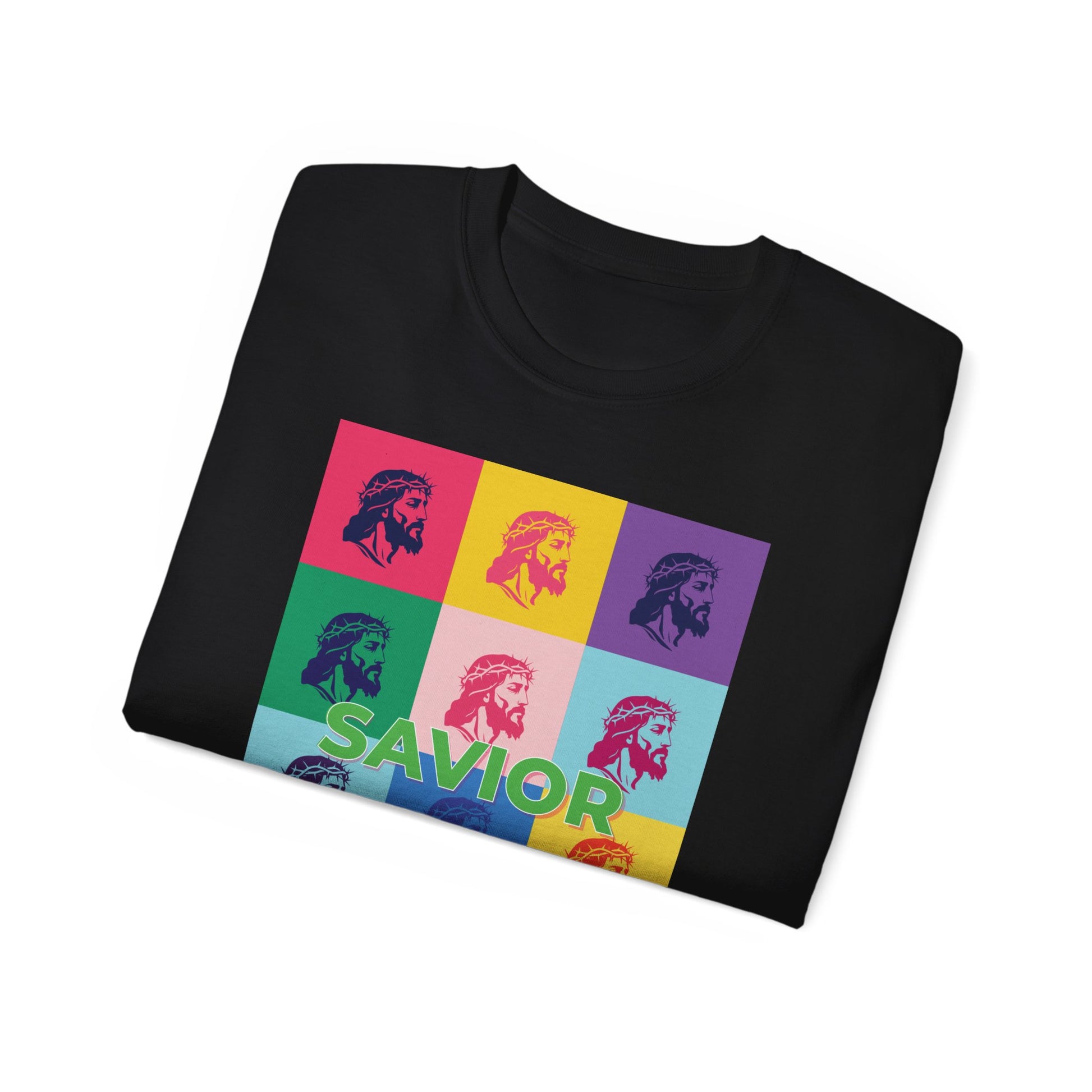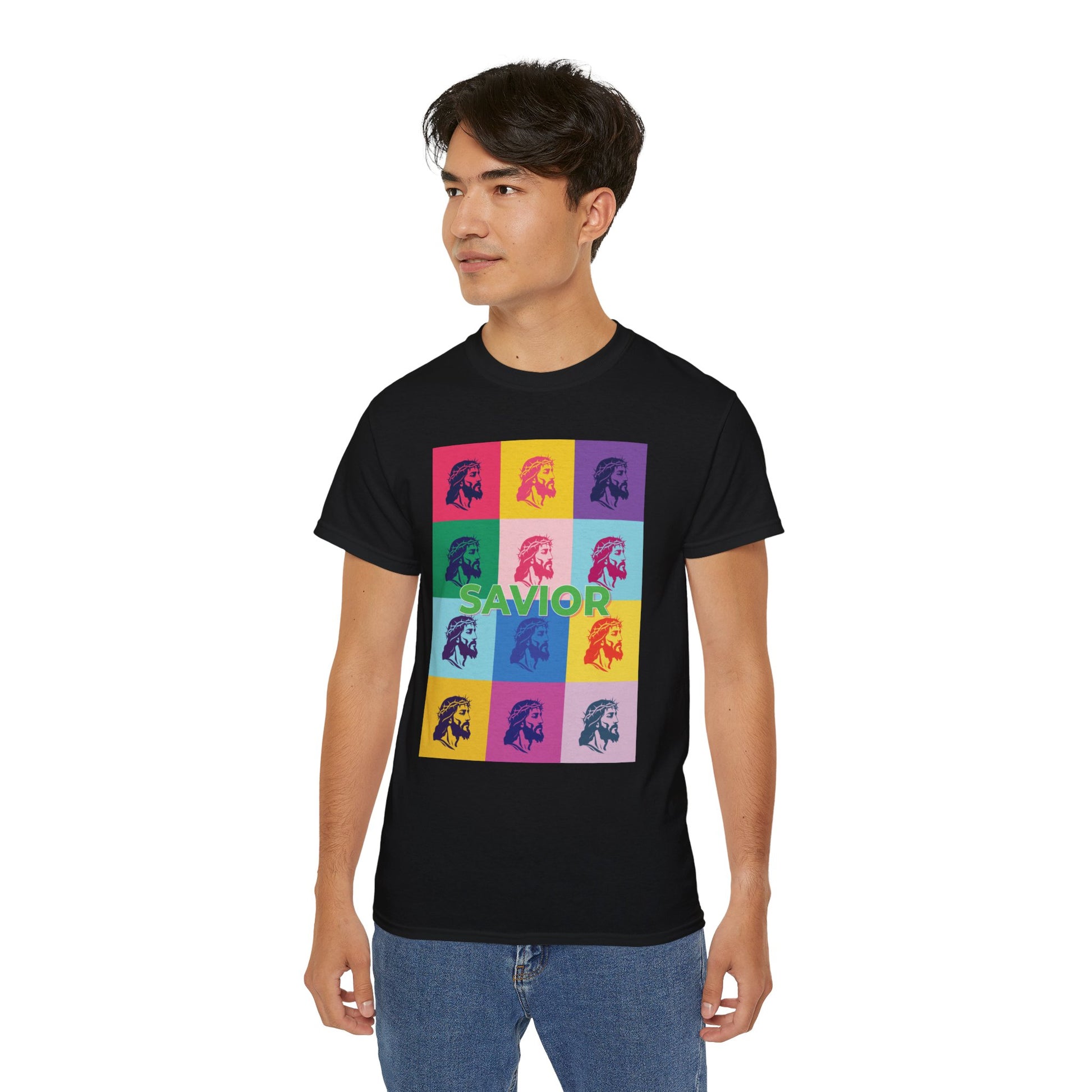 Bold Pop Art Jesus T-Shirt with a Savior Christian design, perfect for men and women who want to showcase their faith. Ideal gift for religious holidays and occasions.