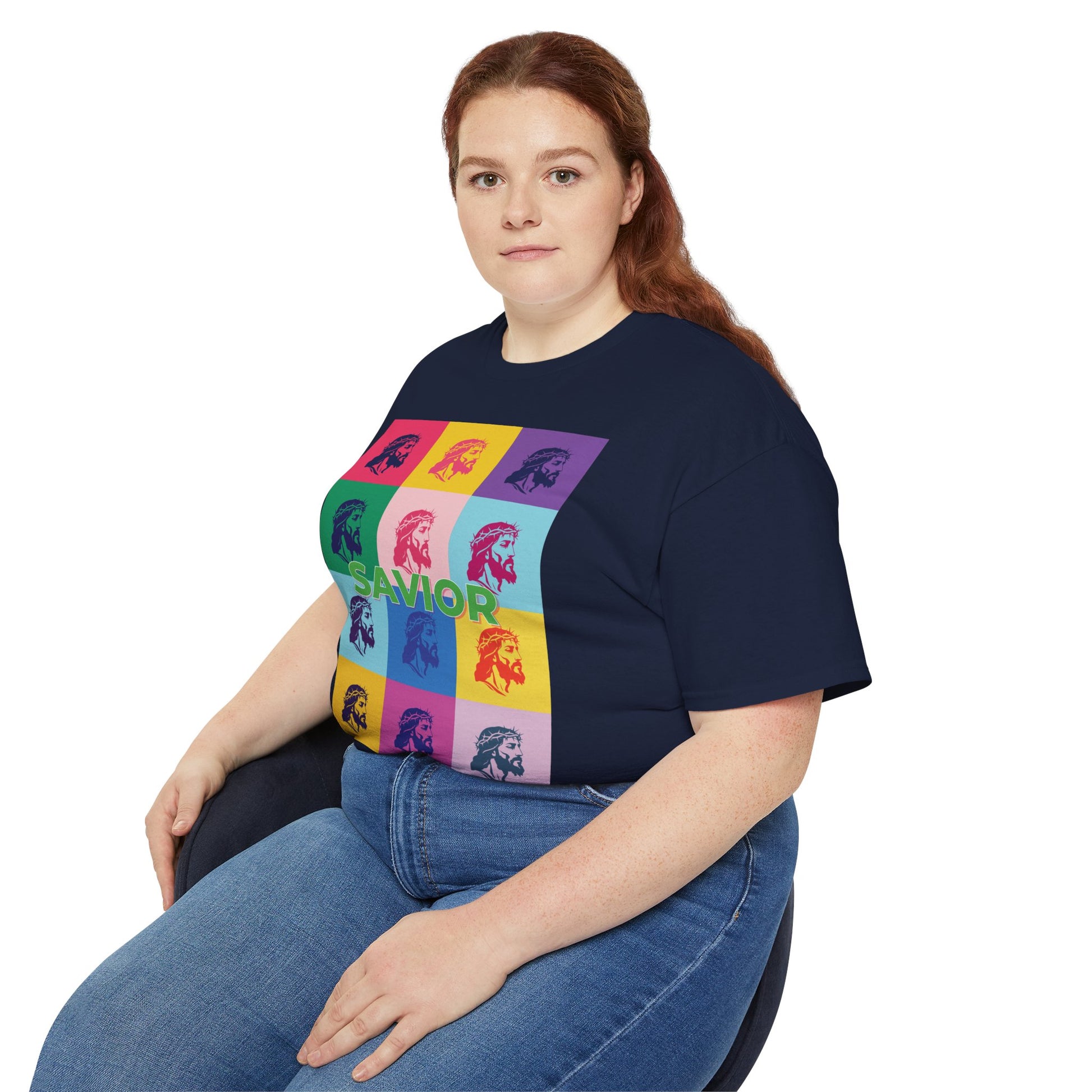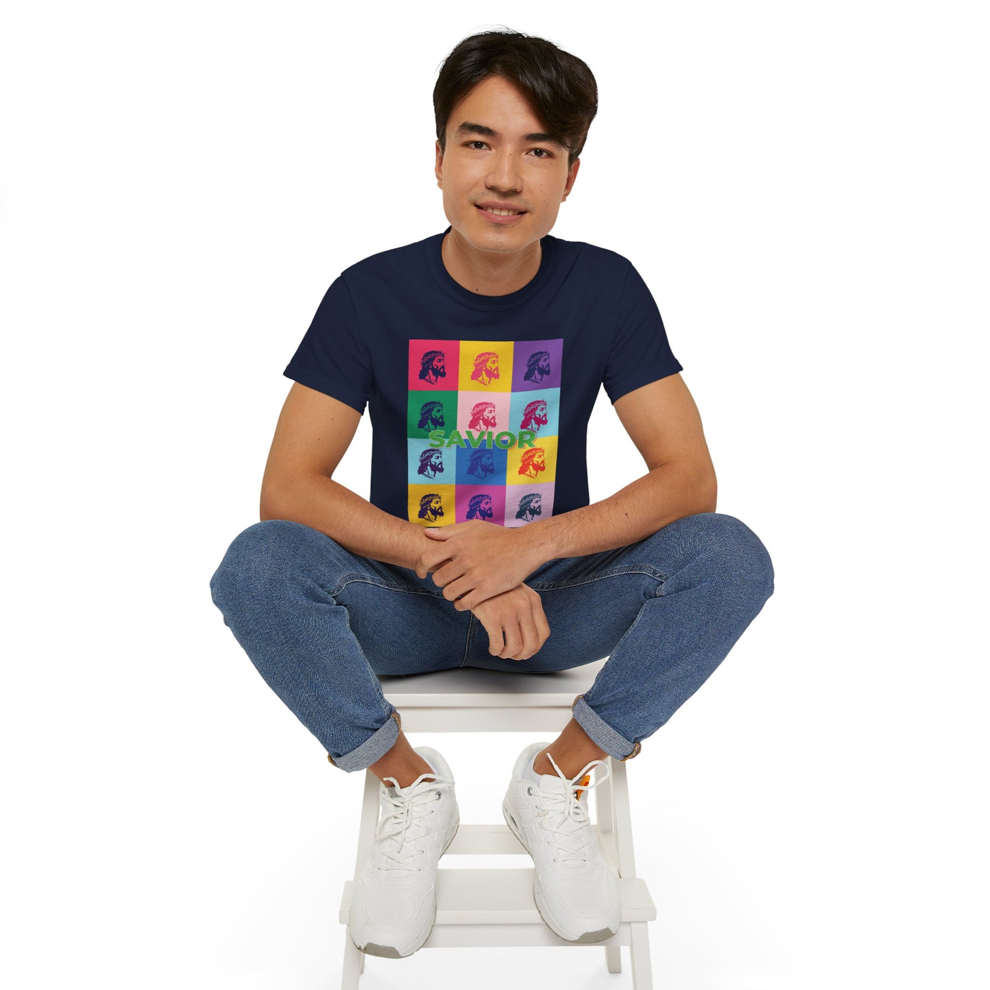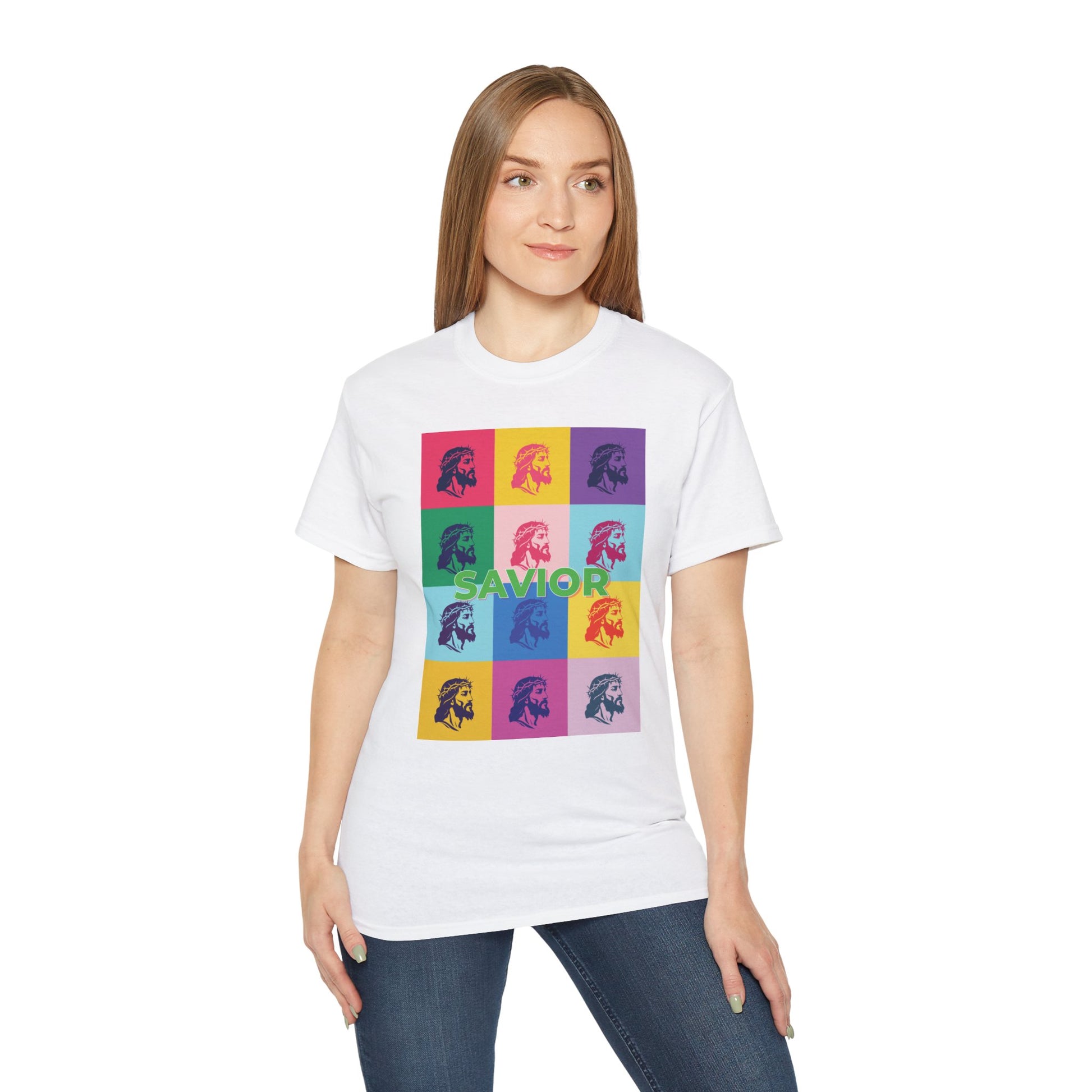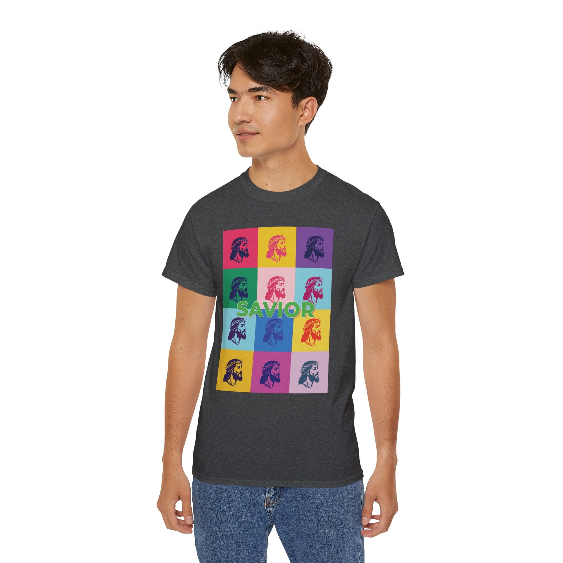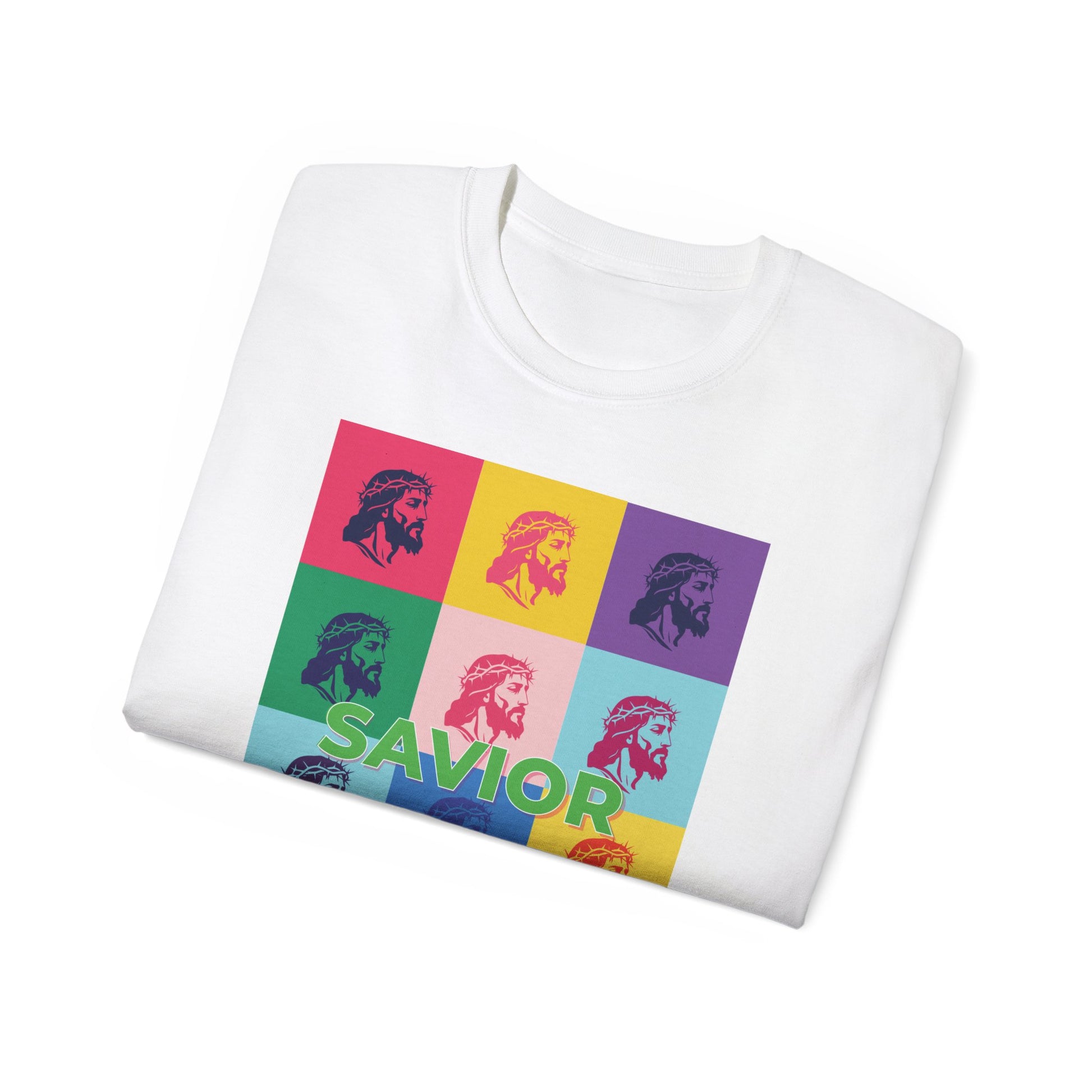 Bold Pop Art Jesus T-Shirt with a Savior Christian design, perfect for men and women who want to showcase their faith. Ideal gift for religious holidays and occasions.