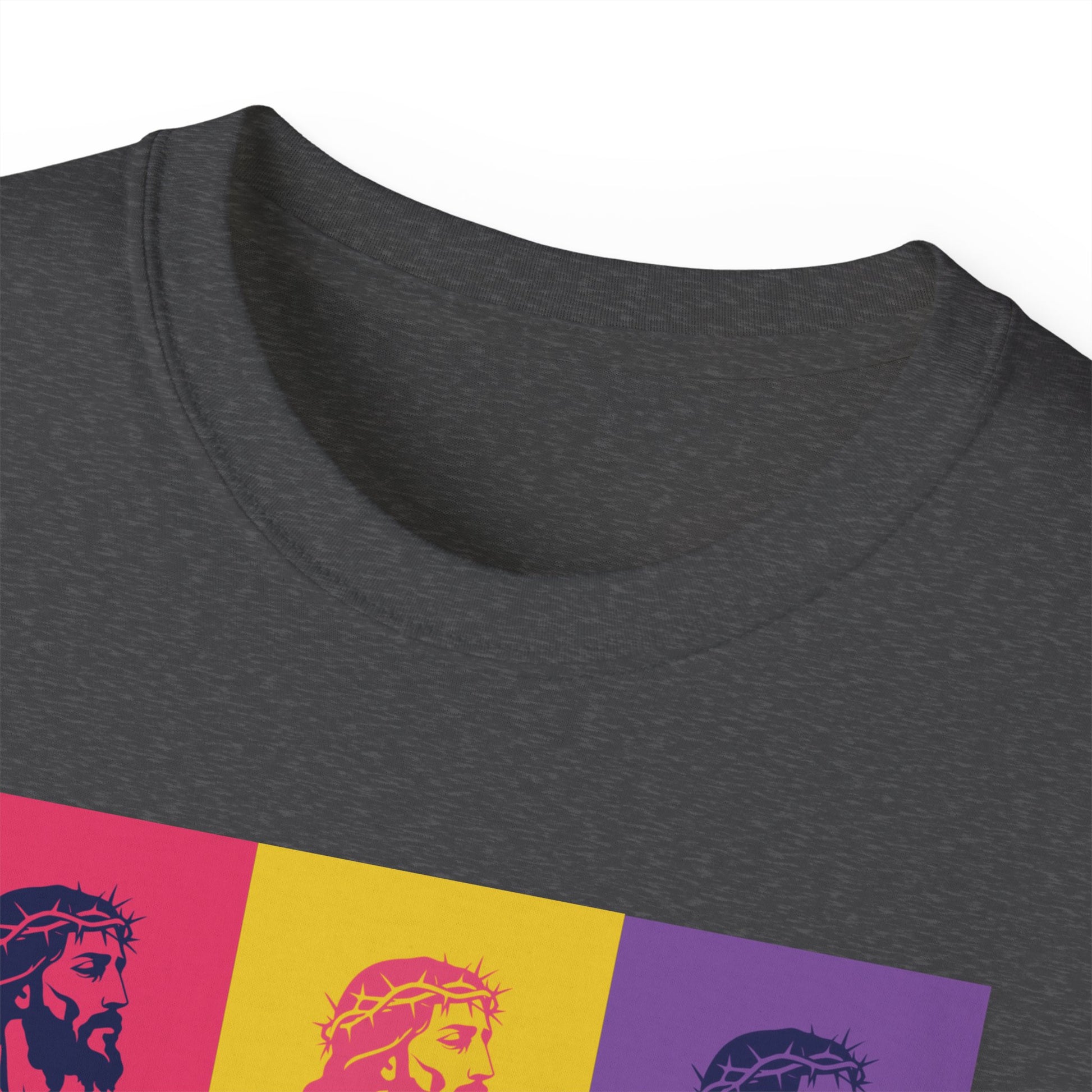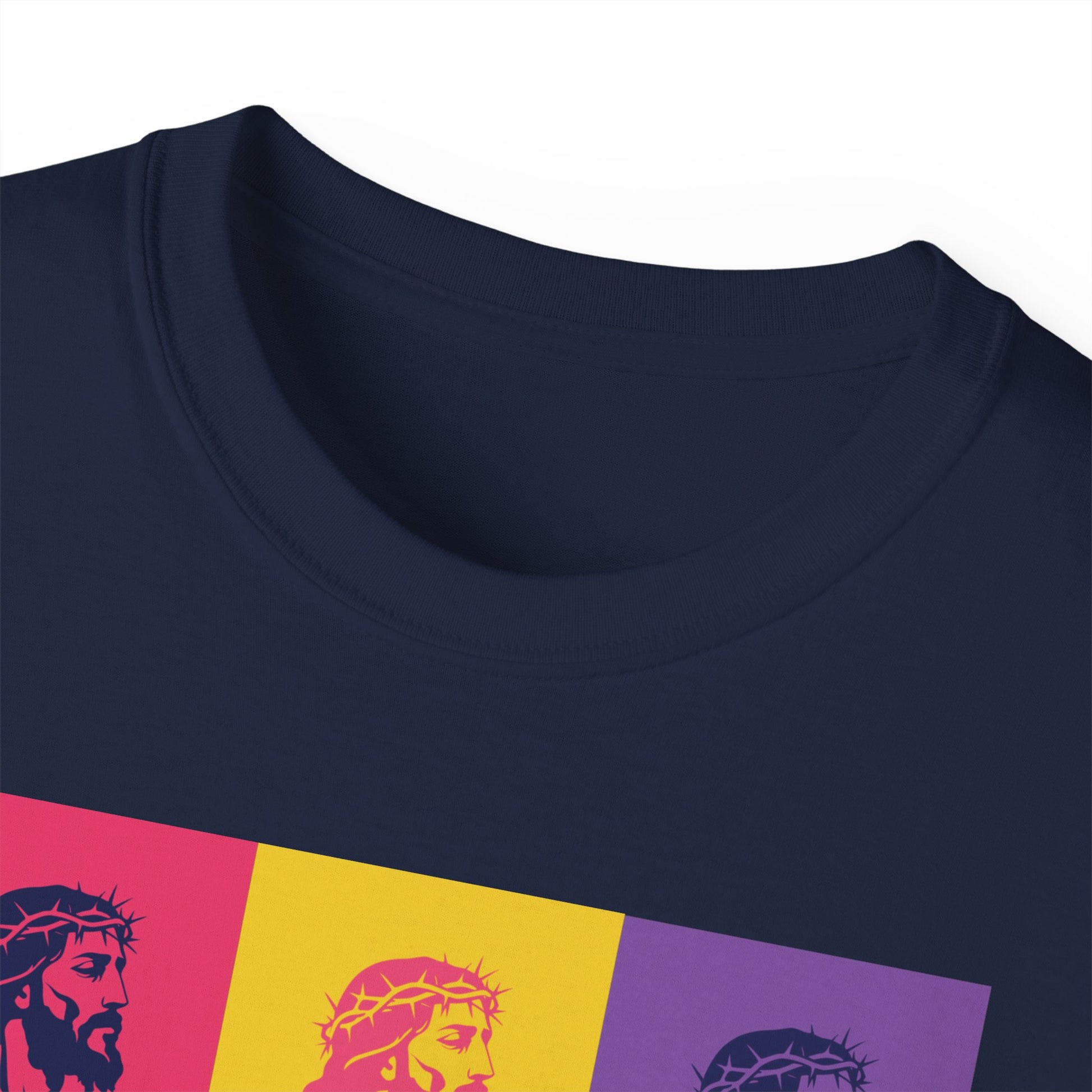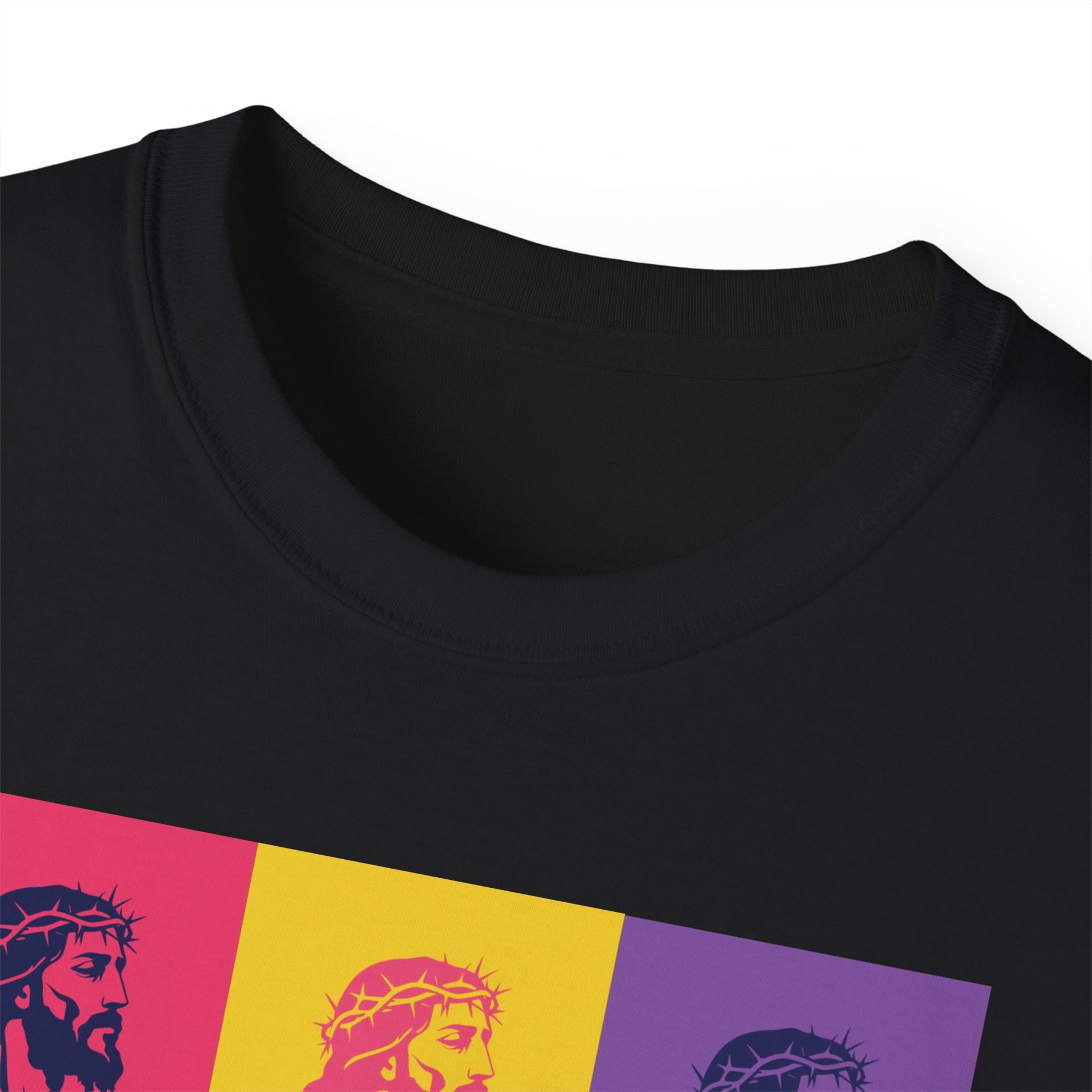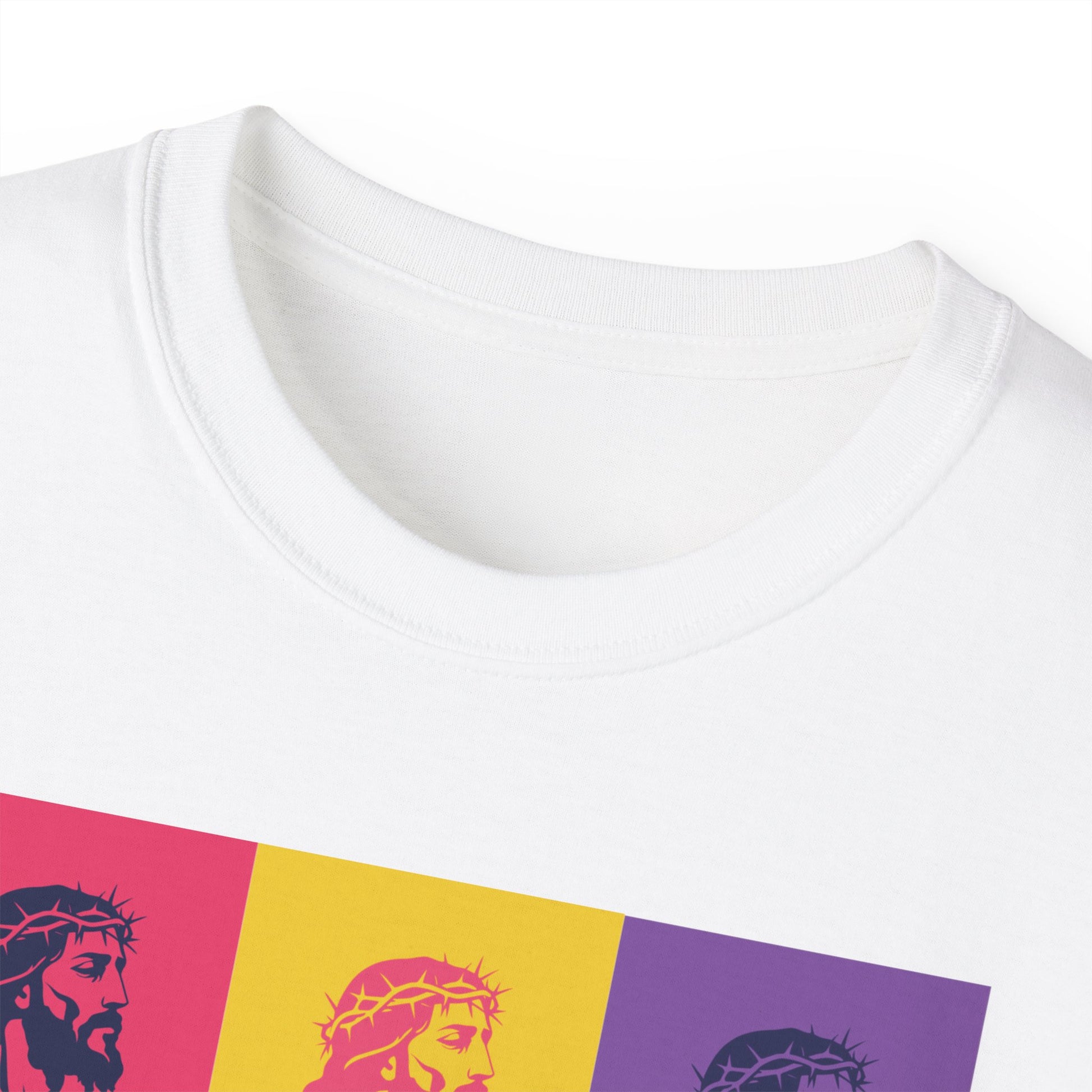 Bold Pop Art Jesus T-Shirt with a Savior Christian design, perfect for men and women who want to showcase their faith. Ideal gift for religious holidays and occasions.