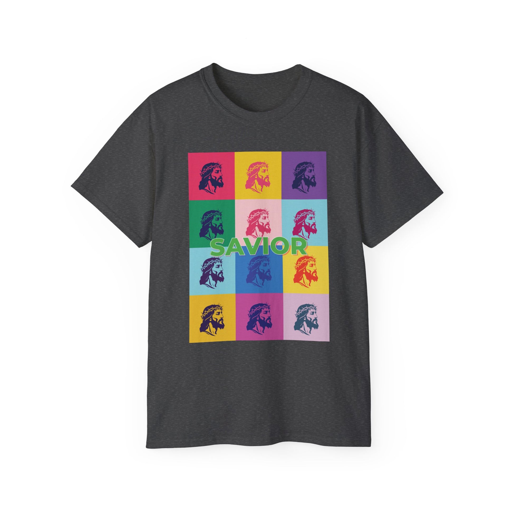 Celebrate your faith with bold simplicity. This “SAVIOR” Christian t-shirt features a vibrant pop art grid of Jesus crowned with thorns, centered around the powerful word SAVIOR. Designed in Warhol-inspired color blocks, this tee makes a striking faith statement that’s modern, meaningful, and wearable.